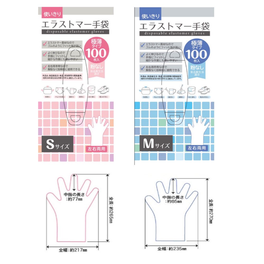 Sサイズ:全長/26.5cm、全幅/21.7cm、中指の長さ/7.7cm