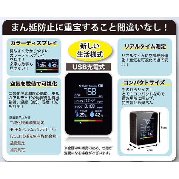 二酸化炭素濃度のほかにホルムアルデヒドや総揮発性有機化合物、温度(℃)、湿度(%)も計測!